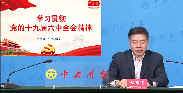 倪邦文介绍了党的十九届六中全会基本情况,重点从“七个深刻理解”逐条梳理解读了党的十九届六中全会精神核心内容和精髓,并从三个方面向在训团干部提出学习贯彻党的十九届六中全会精神的要求。他强调,要认真学习领会全会精神,学懂弄通《决议》的核心要义和实践要求,继续深入开展“学党史、强信念、跟党走”学习教育;要结合工作实际运用,坚持用习近平新时代中国特色社会主义思想这一马克思主义中国化最新成果武装团员青年头脑,对全会精神进行青年化阐释,坚持忠实贯彻《决议》提出的为党育人的具体要求,为党培养社会主义建设者和接班人。