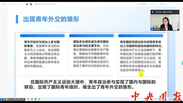 受国组智库邀请,国际青年研究中心教师潘萌围绕“青年外交:塑造未来国际关系的先锋力量”主题,线上为国组智库社团学生作讲座。潘萌详细阐述了青年外交的概念、历史脉络、核心功能与国际局势的互动关系,介绍了青年外交在新时代中国外交中的重要地位和效能目标,并对青年如何成长为塑造未来国际关系先锋力量提出建议。