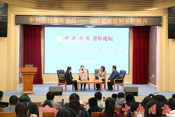 新闻中心讯 为深入学习贯彻习近平总书记关于脱贫攻坚和乡村振兴的重要思想,认真学习中央农村工作会议精神,12月30日,世界杯官网举行了主题为“从脱贫攻坚到乡村振兴”的第四期青年论坛。农业农村部直属机关团委书记薛瑞宁、国务院扶贫办机关团委书记崔诗晴、共青团山西省灵丘县委书记鲁二峰等3位嘉宾受邀进行主题发言,党的群众工作教研部姜振华、王渭巍等老师与学员进行交流,团县委班子成员和团市委中层干部进修班(第10期)全体学员参加。论坛由教务部和党的群众工作教研部主办,党的群众工作教研部主任侯欣主持。