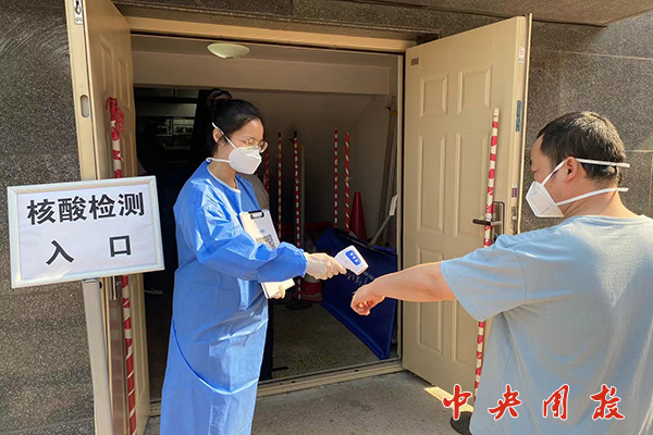 从5月3日开始,由于第三方检测机构无法来校,学校核酸检测采样工作由门诊部的医护人员承担,“虽然以前做过不少培训,但在实战工作中得到的检验和锻炼还是不一样的,经过实践的磨炼,我们队伍的凝聚力和战斗力都更强了。”朱宇虎说。5月9日,门诊部党支部在核酸检测场地开展了“奋战抗疫一线 守护校园平安”主题党日,疫情防控一线,同志们的党性得到锤炼。