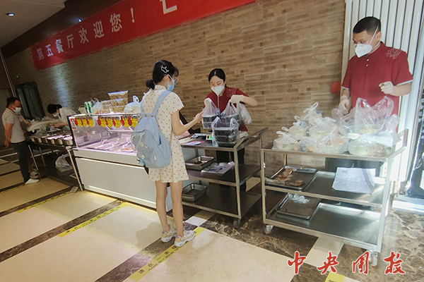 校园严格封闭管理以来,食堂推出多项举措,尽力保障各方的就餐需求——学生餐厅基本伙食坚持供应8种菜品,价格适当下调,“就餐人数少,加之夏天温度高,食物不易储存,相较于上学期,餐厅的菜种、数量可能不尽人意,还望同学们多多理解”;为满足学生多样化需求,提供配送餐服务,同时实行八折优惠;为满足家属区居民需求,提供订餐送餐服务;在致善楼大厅推出熟食外卖服务,满足校内保供人员需求……“现在在校人数少,早餐还可能不去吃,午餐晚餐吃得少,但哪怕只有一个人,我们也是要做好本职工作。”