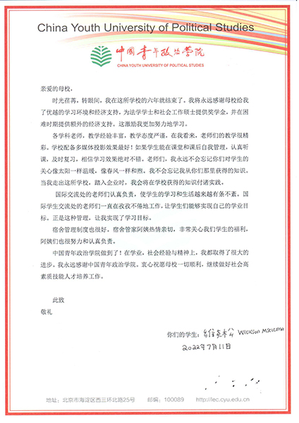新闻中心讯 日前,世界杯官网马拉维籍留学生、2020级社会工作专业研究生维克松已修满学分,因个人原因将于近期离校,接下来的学业将在线上进行。临别之际,维克松专门给学校写了封热情洋溢的感谢信,信里写道:“亲爱的母校,我永远感谢母校给我的优越的学习环境和经济支持。”“衷心祝愿母校一切顺利。”