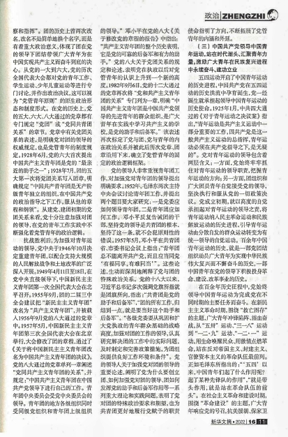 该文认为,中国共产党在百余年奋斗征程中,始终把青年工作作为党的一项极为重要的工作,在领导青年工作中积累了丰富的经验,“党管青年”是贯穿党的青年工作的政治灵魂和鲜明主线。“党管青年”有着丰富的政治内涵,可以从党缔造共青团、党领导共青团、党领导青年运动、党引领青年发展四个维度来理解把握。进入新时代,党的文件中首次明确提出“坚持党管青年原则”。这一原则的提出,进一步从根本上揭示了党与团、党与青年关系的本质内核,丰富和发展了马克思主义青年观,标志着党的青年工作理论更加成熟。坚持党管青年原则,是新时代共青团工作和青年工作沿着正确方向推进的根本保证,对于团结组织动员广大青年向着第二个百年奋斗目标、向着中华民族伟大复兴迈进具有重大意义。