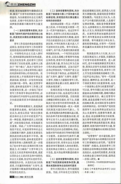 中共党史与青运史系主任王冬梅教授在《中国青年社会科学》2022年第3期发表的学术论文《“党管青年”的政治内涵、理论贡献与时代意义》,被《新华文摘》2022年16期全文转载。