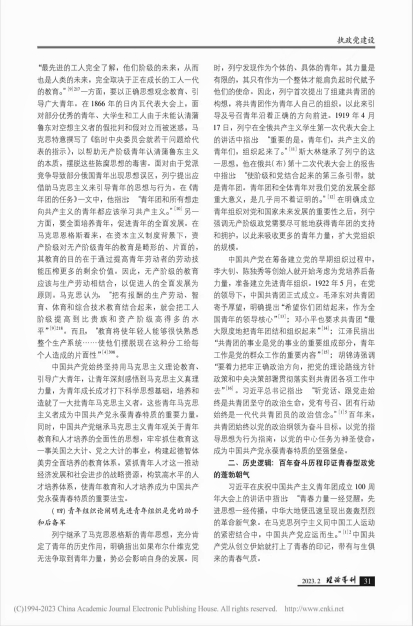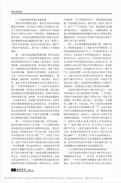 我系教师黄陈晨、董大伟在《理论导刊》2023年第2期发表学术文章《理论·历史·实践:中国共产党青春特质的三重逻辑》。该文认为,立志于中华民族千秋伟业的中国共产党,百年恰是风华正茂。青春特质是中国共产党始终保持朝气蓬勃的“基因密码”,也是党永葆旺盛生命力、实现长期执政的内在力量,具有深刻的理论逻辑、历史逻辑和实践逻辑。从理论逻辑看,中国共产党的青春特质根植于马克思主义青年观,是对无产阶级政党与青年关系理论的继承发展。从历史逻辑看,中国共产党的青春特质熔铸于党的百年奋斗历程,是对百年党史所蕴含的青春动力的延续传承。从实践逻辑看,中国共产党的青春特质发展于党的自我建设中的革新特性,是新征程上开创伟大社会革命和伟大自我革命新局面的必然要求。