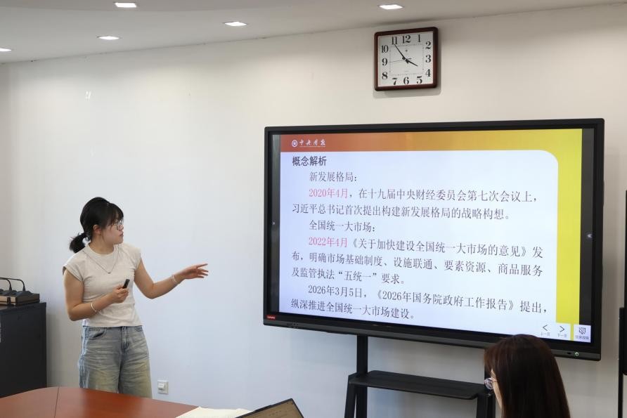 我院“青马新声”理论宣讲团讲师杨艺围绕《全国统一大市场》这一主题,从理论、历史、现实案例三个维度,讲解全国统一大市场在新发展格局中的重要作用。