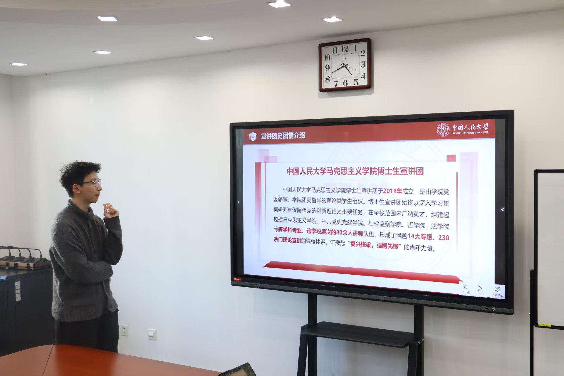 随后,中国人民大学马克思主义学院博士生宣讲团团长嵇睿就该院宣讲团基本情况进行了讲解介绍,双方宣讲团负责人分别介绍宣讲团建设、日常运营、活动开展等工作情况,为宣讲团发展互提建议、共促提升。