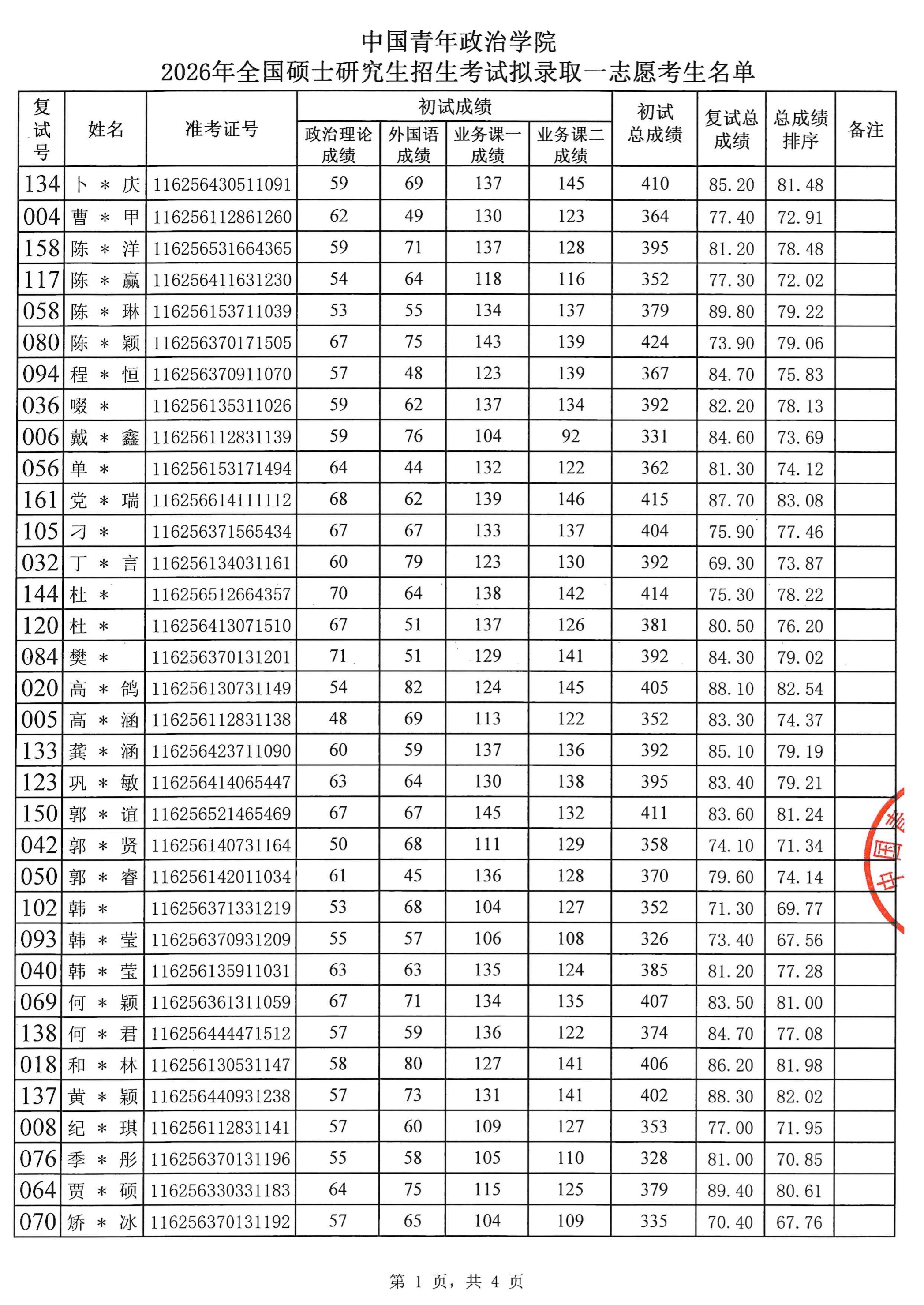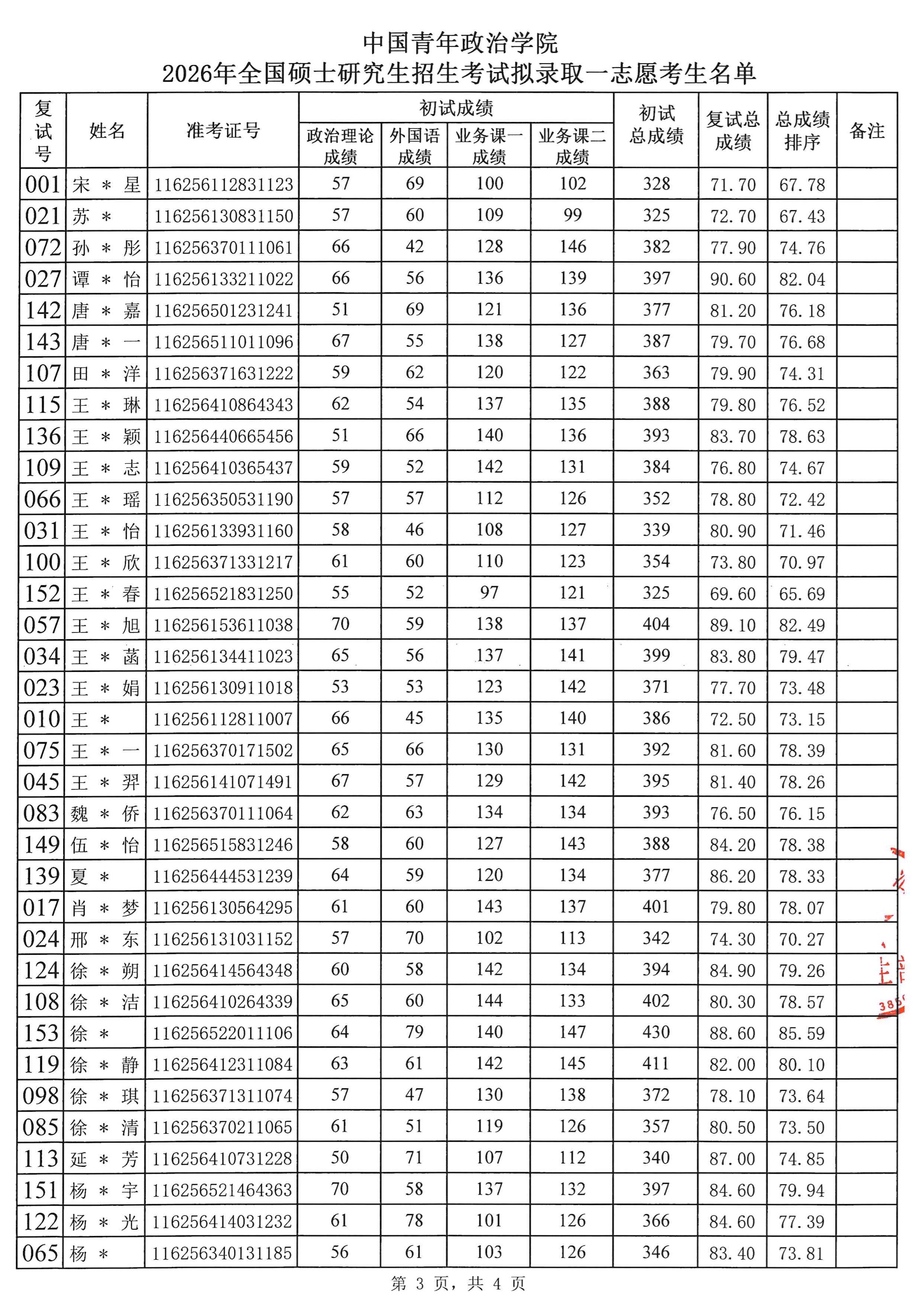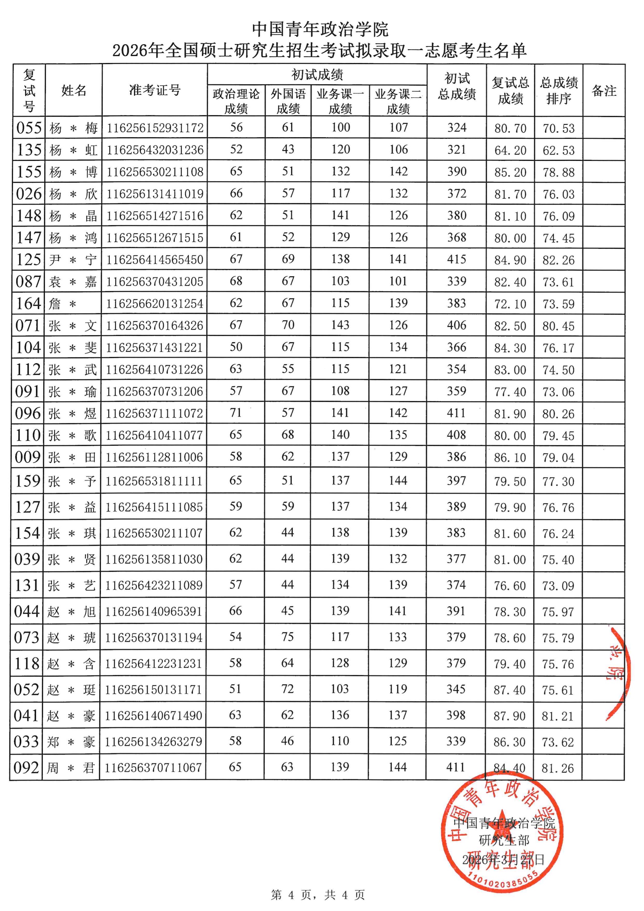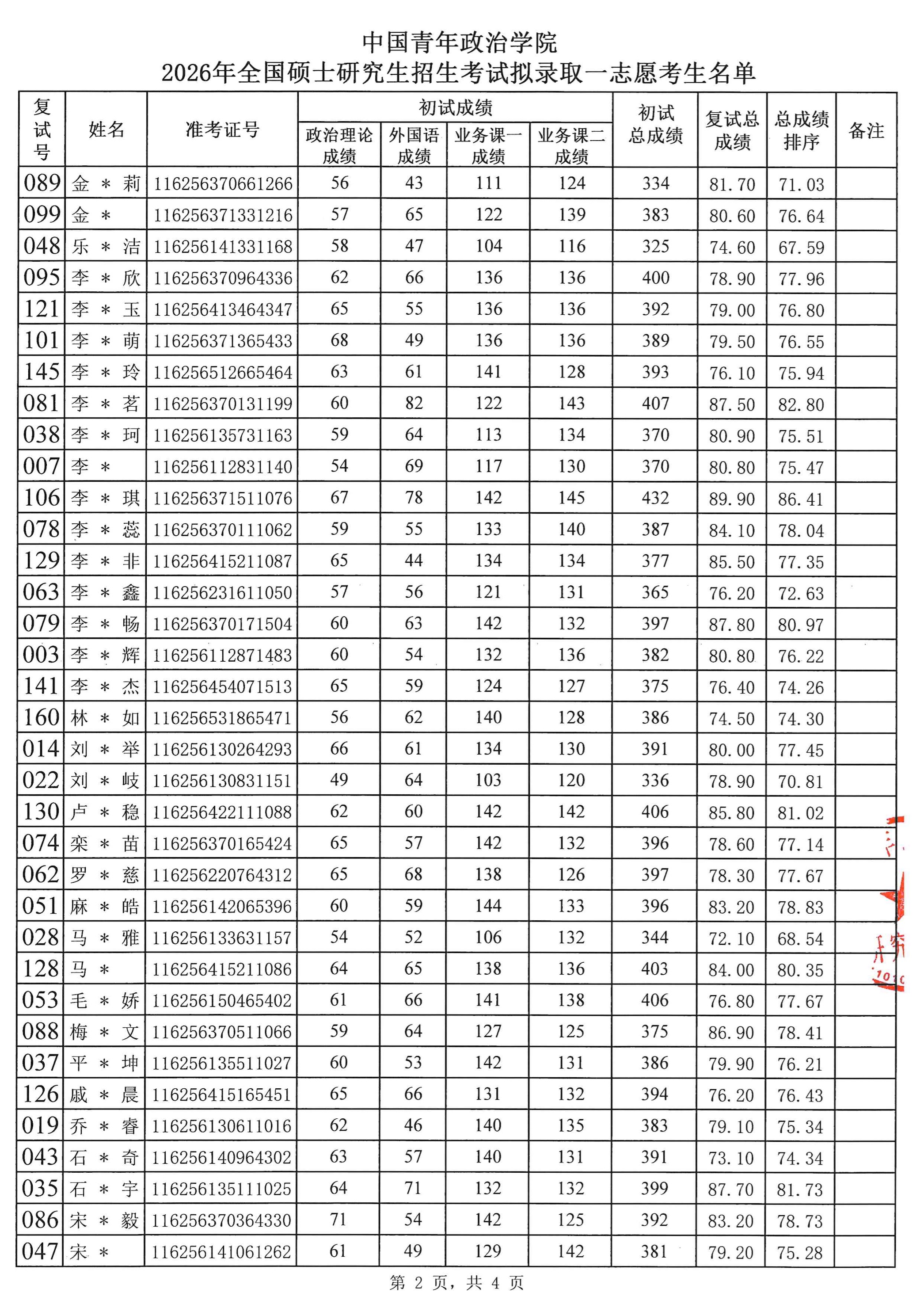 2026年全国硕士研究生招生考试中国青年政治学院拟录取考生名单(一志愿)