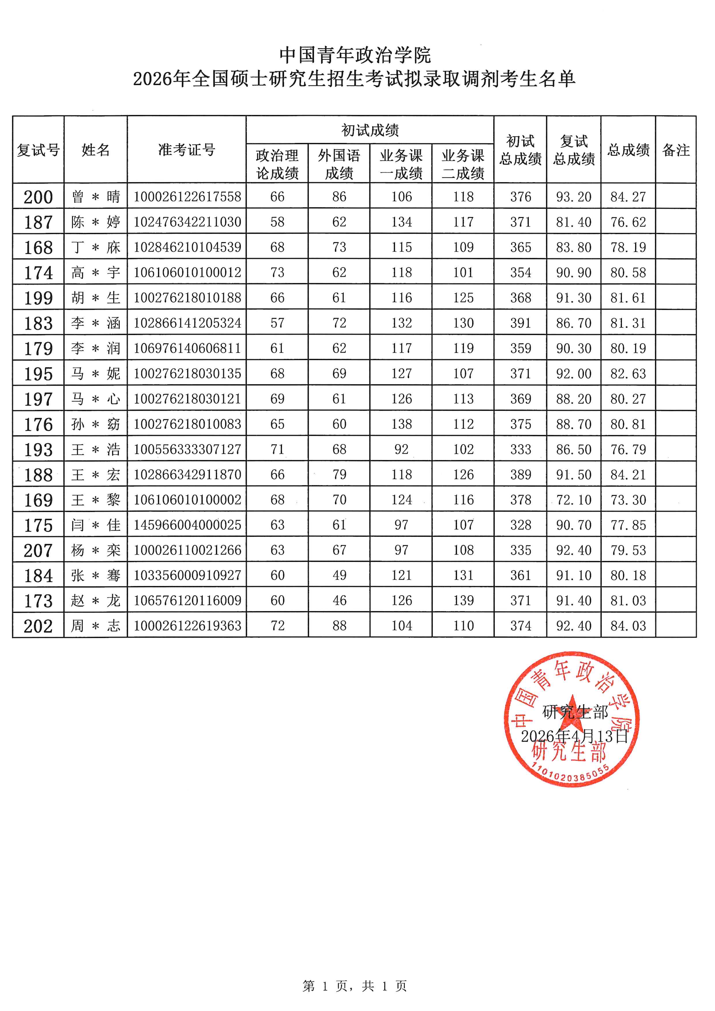 2026年全国硕士研究生招生考试中国青年政治学院拟录取考生名单(调剂)